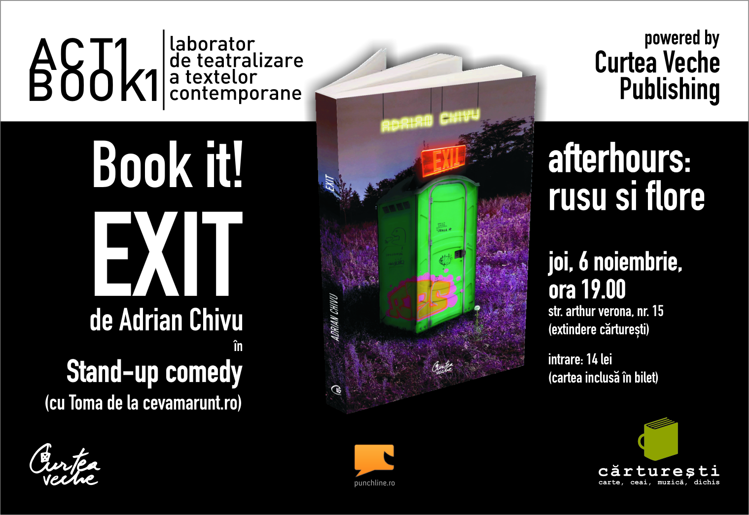 Joi acum, pe 6.11, de la 19.00, se lanseaza cartea lui Adrian Chivu -> Exit, in cadrul proiectului act1book1. (Prin definitie, e un laborator de teatralizare a textelor contemporane.). De data asta, o facem usor altfel, cu un show de stand up comedy cu Toma (Ceva Marunt), + afterparty cu Rusu & Flore