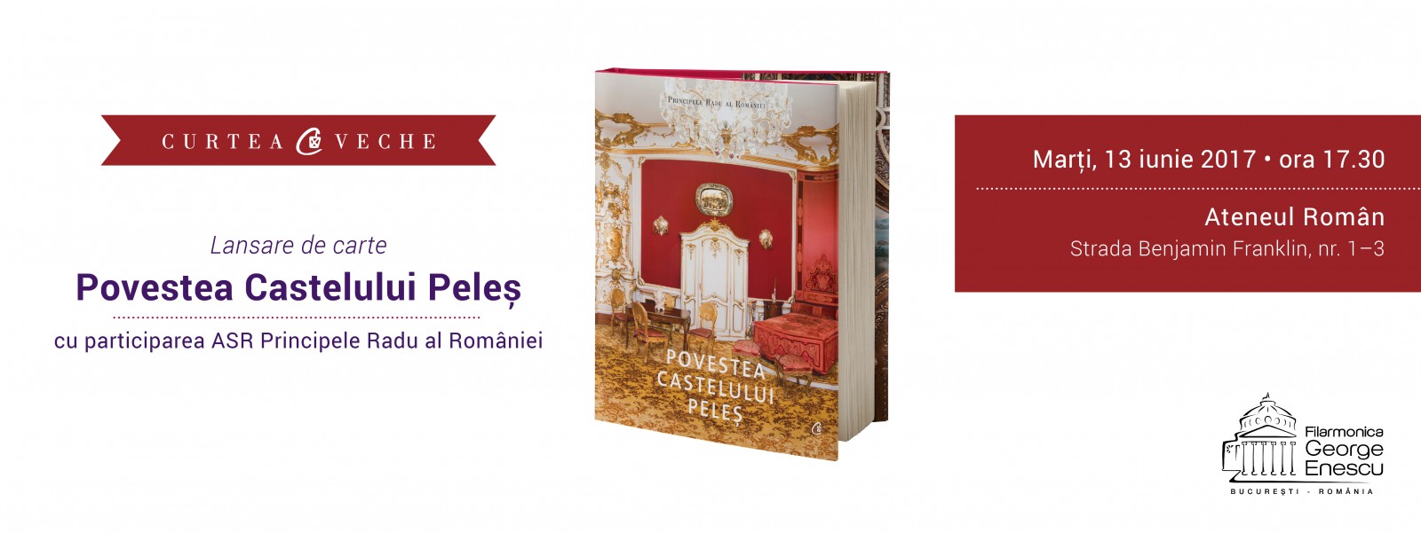 Curtea Veche Publishing și Filarmonica „George Enescu“ vă invită marți, 13 iunie 2017, începând cu ora 17.30, la evenimentul de lansare a cărții-album „Povestea Castelului Peleş”, scrisă de Alteța Sa Regală Principele Radu al României. Evenimentul va fi găzduit de Ateneul Român și va avea loc în foaier (str. Benjamin Franklin, nr. 1-3).
