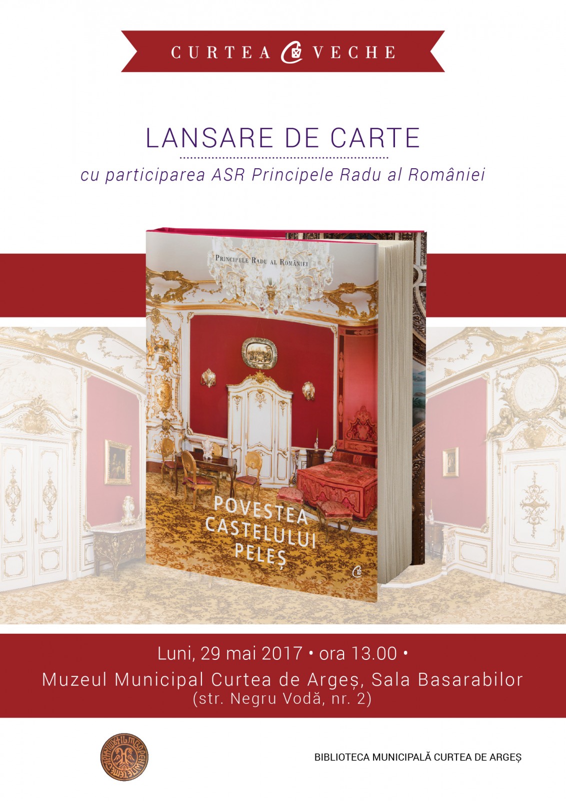 Vă invităm luni, 29 mai 2017, începând cu ora 13.00, la evenimentul de lansare a cărții-album „Povestea Castelului Peleş”, scrisă de Alteța Sa Regală Principele Radu al României. La eveniment, va lua cuvântul, alături de Alteţa Sa Regală Principele Radu, domnul Octavian Sachelarie, directorul Bibliotecii Județene “Dinicu Golescu” din Piteşti. Oficiile de gazdă vor fi făcute de domnul Ştefan Dumitrache, director al Muzeului Municipal Curtea de Argeş.