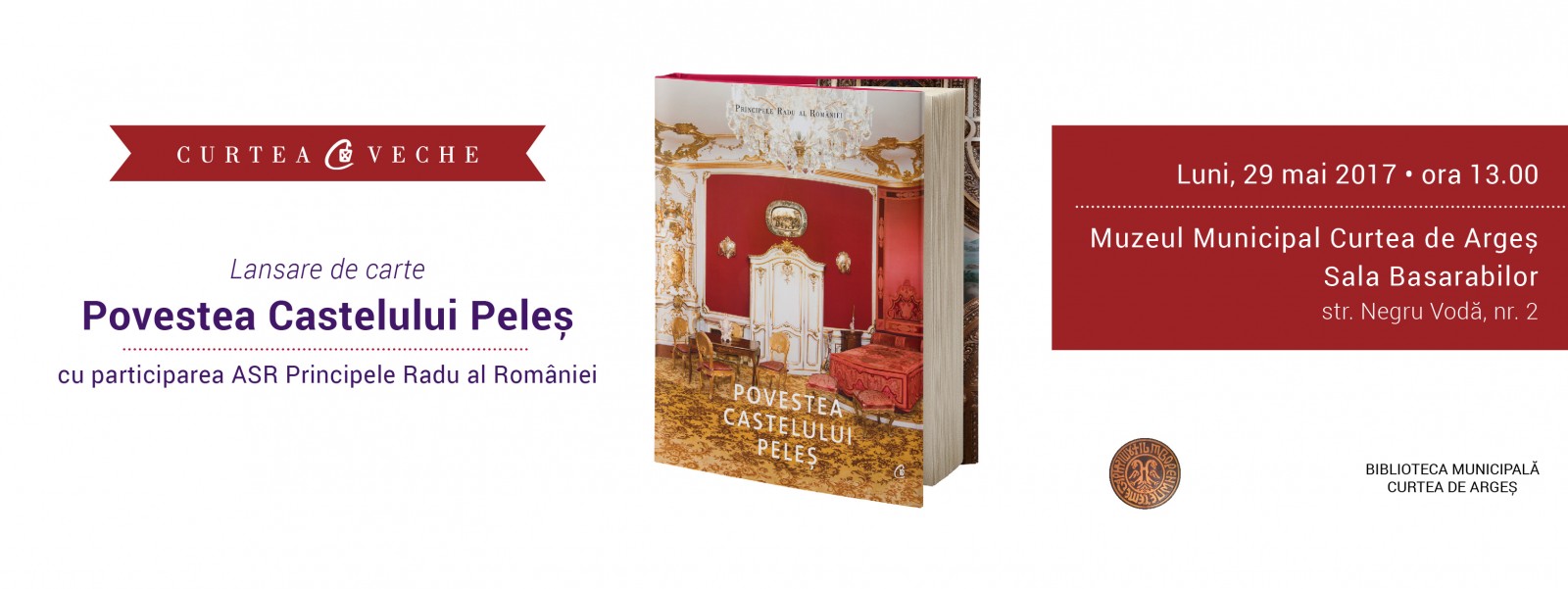 Vă invităm luni, 29 mai 2017, începând cu ora 13.00, la evenimentul de lansare a cărții-album „Povestea Castelului Peleş”, scrisă de Alteța Sa Regală Principele Radu al României. La eveniment, va lua cuvântul, alături de Alteţa Sa Regală Principele Radu, domnul Octavian Sachelarie, directorul Bibliotecii Județene “Dinicu Golescu” din Piteşti. Oficiile de gazdă vor fi făcute de domnul Ştefan Dumitrache, director al Muzeului Municipal Curtea de Argeş.