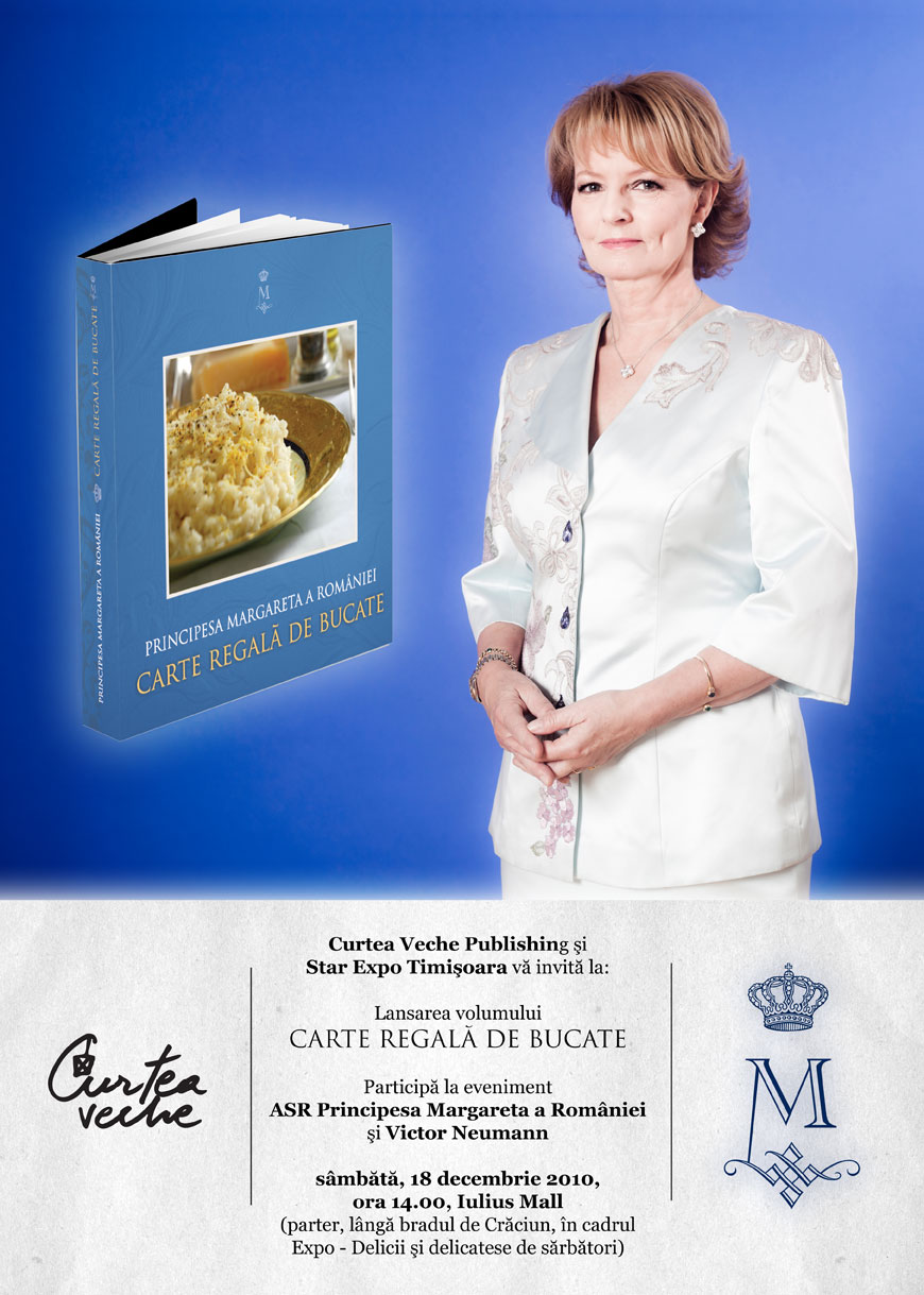 În cazul în care aţi fi dorit să primiţi un autograf de la ASR Principesa Margareta şi nu aţi reuşit să ajungeţi în Bucureşti la lansarea volumului Cartea regală de bucate, aveţi ocazia de a participa mâine, 18 decembrie, în Timişoara. Lansarea Cărţii regale de bucate va începe la ora 14.00 în incinta Iulius Mall Timişoara (demisol, lângă bradul de Crăciun, în cadrul Expo – delicii şi delicatese de sărbători). În cadrul evenimentului vor lua cuvântul ASR Principesa Margareta, Brînduşa Armanca şi Victor Neumann.