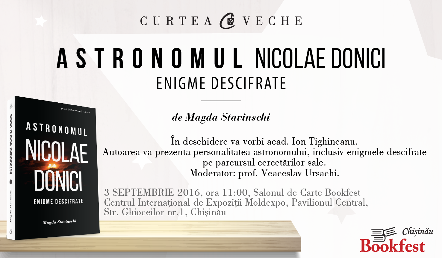 Curtea Veche Publishing are plăcerea de a anunța participarea editurii la cea de-a XXV-a ediție a Salonului Internațional de Carte Bookfest Chișinău, ce va avea loc în Pavilionul Central al Moldexpo în perioada 31 august — 4 septembrie 2016. În cadrul târgului de carte va avea loc lansarea volumului „Astronomul Nicolae Donici. Enigme descifrate” scris de Magda Stavinschi, cercetător onorific al Institutului Astronomic al Academiei Române. Evenimentul va avea loc în data de 3 septembrie 2016, ora 11:00.