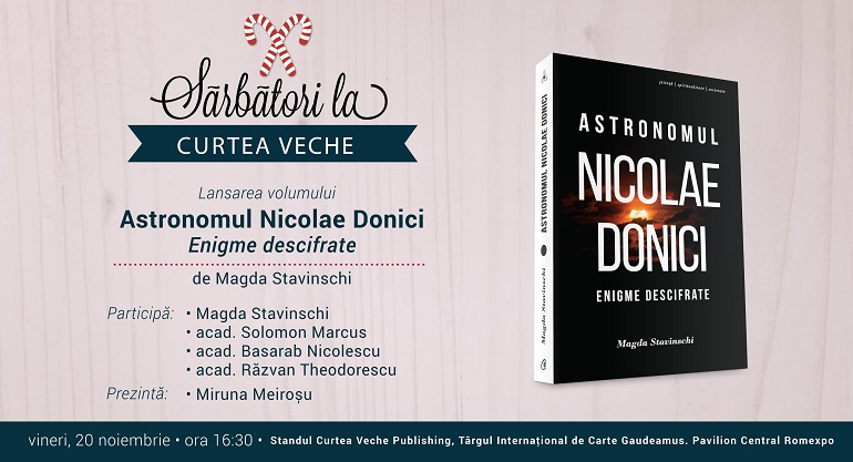 Vineri, 20 noiembrie 2015, începând cu ora 16.30, Curtea Veche Publishing vă invită la evenimentul de lansare a volumului „Astronomul Nicolae Donici. Enigme descifrate” de Magda Stavinschi, ce va avea loc în cadrul Târgului Internațional Gaudeamus – Carte de învățătură 2015. Alături de autoare, vor lua cuvântul acad. Solomon Marcus, acad. Basarab Nicolescu și acad. Răzvan Theodorescu, iar oficiile de gazdă vor fi făcute de Miruna Meiroșu.
