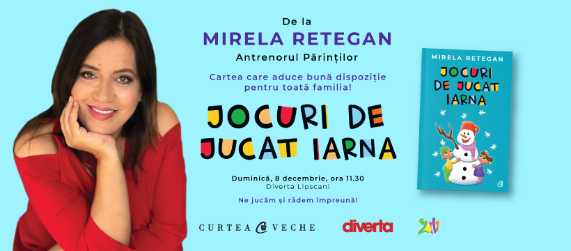 Duminică, 8 decembrie 2019, de la ora 11:30 ne jucăm și râdem împreună. Curtea Veche Publishing și Diverta vă învită să descoperiți o nouă carte din deja bine-cunoscuta serie pentru superpărinți și supercopii – „Jocuri de jucat iarna”. Lansăm împreună noua carte a Mirelei Retegan, în Magazinul Diverta Lipscani (Str. Lipscani nr. 30-34), cu buna-dispoziție asigurată de Gașca Zurli. Ne vor fi alături Fetița Zurli, Tashu, Lulu, Zâna Bună și Vrăjimăturica.