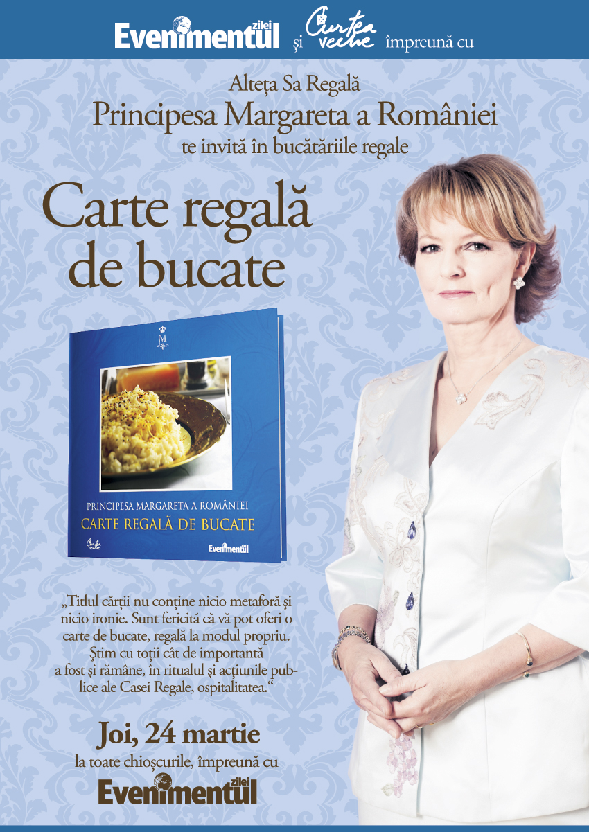 Începând de joi, 24 martie, puteţi găsi Cartea regală de bucate a Alteţei Sale Regale Principesa Margareta a României la toate chioşcurile de ziare, numai împreună cu Evenimentul Zilei!