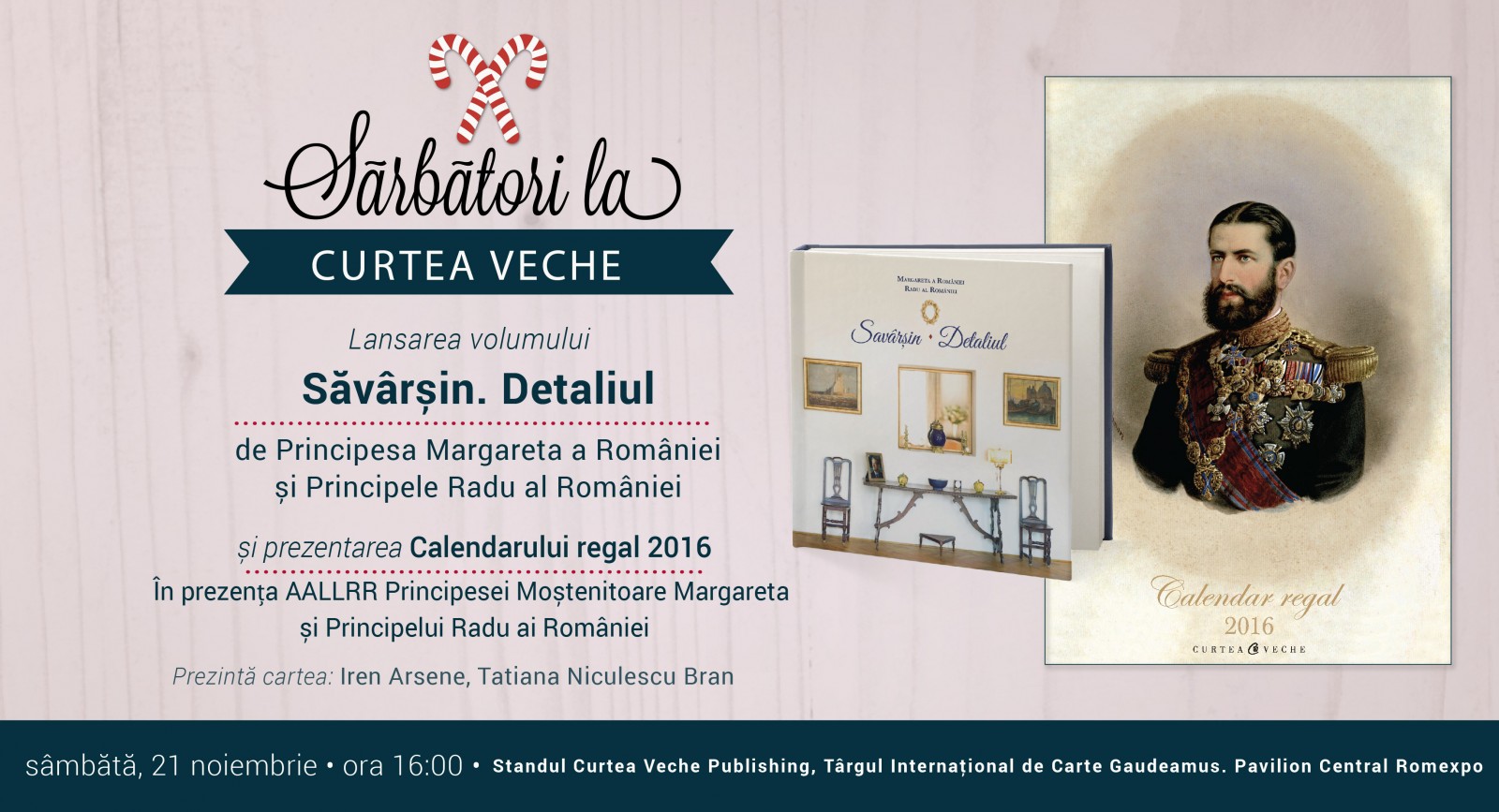 Sâmbătă, 21 noiembrie, la ora 16.00, în cadrul Târgului Internațional de Carte Gaudeamus, Curtea Veche Publishing vă invită la evenimentul de lansare a două noi titluri regale: Calendarul regal 2016 și albumul „Săvârșin. Detaliul” de Principesa Margareta și Principele Radu ai României. Evenimentul va avea loc la standul editurii, în Pavilionul Central Romexpo, în prezența Altețelor Lor Regale Principesa Moștenitoare Margareta și Principele Radu. Alături de Iren Arsene, director și cofondator al editurii, va lua cuvântul scriitoarea Tatiana Niculescu Bran. Moderator va fi Miruna Meiroșu, PR Manager Curtea Veche Publishing. Evenimentul va include o sesiune de autografe.