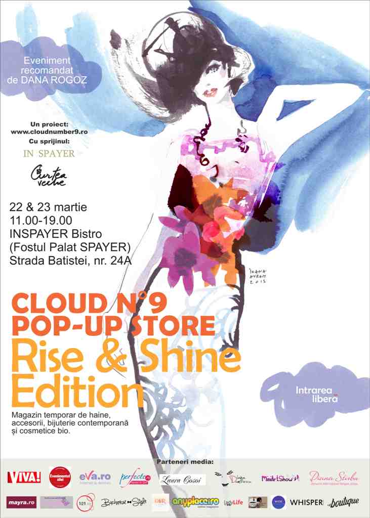 Cele mai hot piese ale sezonului primăvară / vară 2014 te aşteaptă, în weekend-ul 22-23 martie, la cea de-a VIII-a ediţie a pop-up store-ului Cloud No.9. O ediţie plină de culoare, în care spunem adio iernii şi aducem tribut primăverii, anotimpul care le inspiră cel mai mult pe fashioniste. Cloud No. 9 Pop-up Store – Rise & Shine Edition- se deschide, între orele 11.00 şi 19.00, la Inspayer Bistro (Palatul Spayer, strada Batiştei, 24 A).