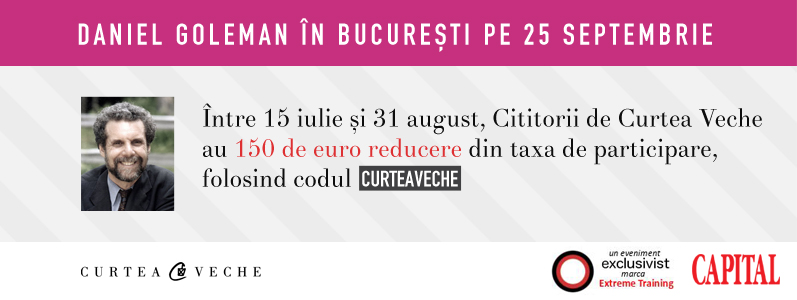Daniel Goleman vine în Romania pe 25 septembrie 2013. Detalii complete despre evenimentul de business al anului, “Leadership-Puterea Inteligenței Emoționale”, găsiți pe http://goleman.traininguri.ro/inscriere/. Folosind codul promo ”curteaveche” la înregistrarea, veți beneficia de 150 E discount.