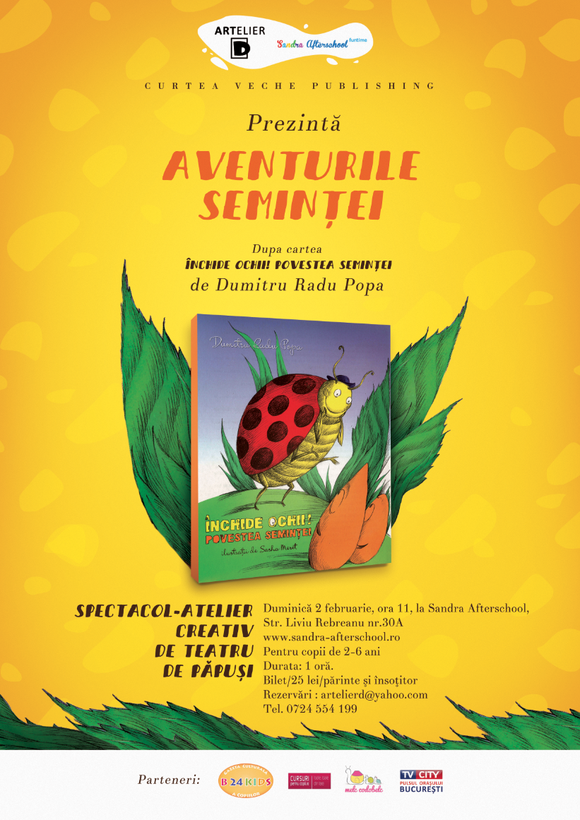 Duminică 2 februarie, ora 11 -spectacol atelier creativ Aventurile seminţei, la Sandra Afterschool, str Liviu Rebreanu nr. 30A. Teatru de păpuşi şi desen: desenăm seminţe, flori şi frunze din povestea seminţei.