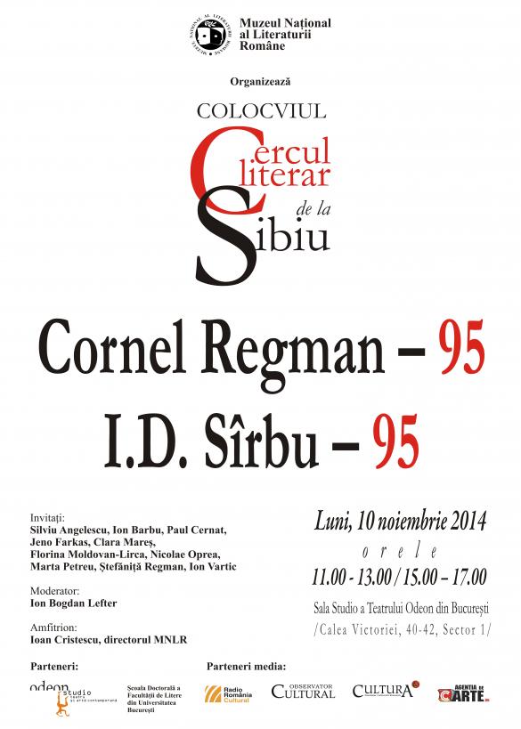 Luni, 10 noiembrie,  între orele 11.00 – 13.00 și 15.00 – 17.00, va avea loc Colocviul Cercul literar de la Sibiu – Cornel Regman – 95, I.D. Sîrbu – 95. Evenimentul va fi găzduit de Sala Studio a Teatrului Odeon (Calea Victoriei 40 – 42, Sector 1).