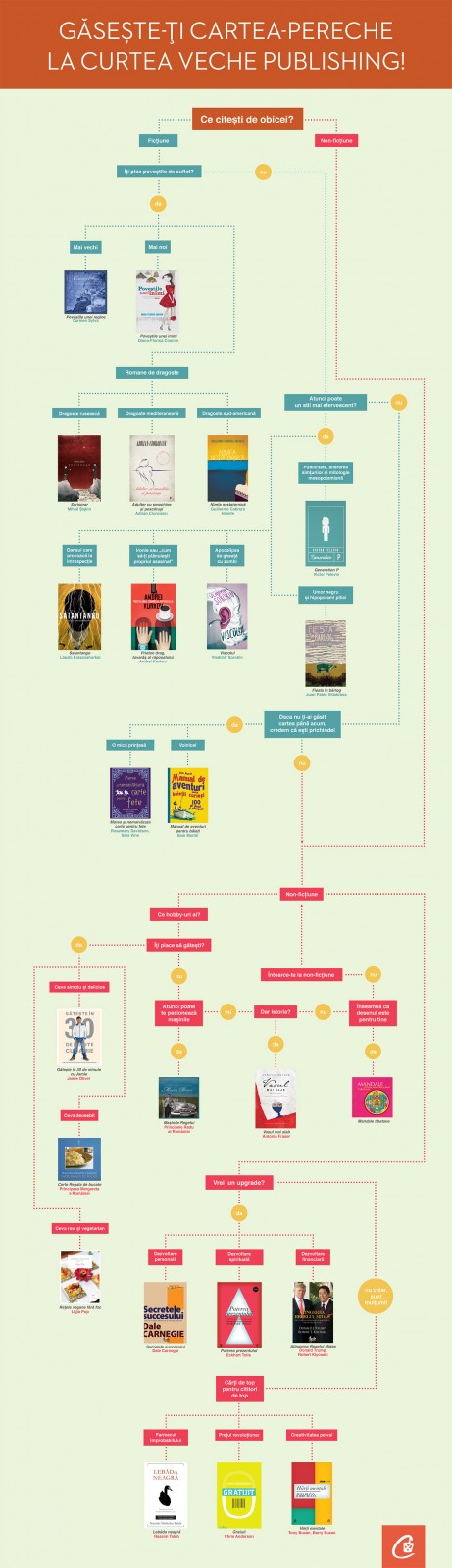 Cu această ocazie am lansat special pentru îndrăgostiții de cărți un infografic care să vă ghideze către cartea potrivită. Așadar, vă invităm să îl descărcați și să vă distrați pe drumul către cartea inimii voastre. E posibil să fiți surprinși la finalul traseului!