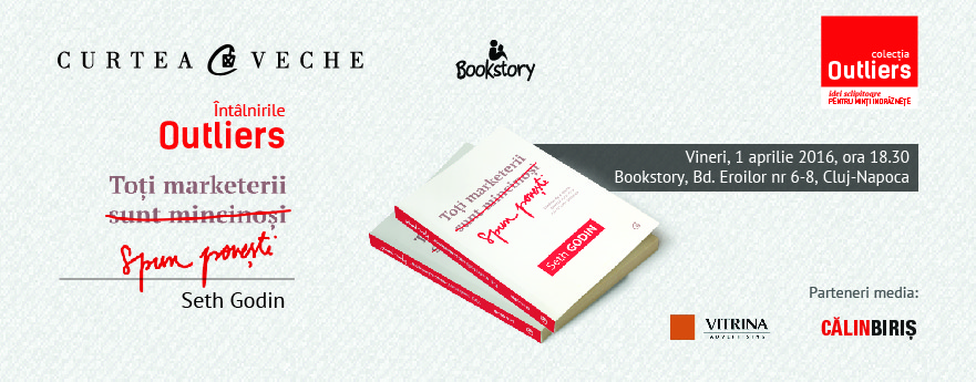 Nu toți marketerii sunt mincinoși, însă câțiva dintre ei vor spune povești de 1 aprilie la Cluj-Napoca. Curtea Veche Publishing continuă seria Întâlnirilor OUTLIERS cu o lansare găzduită de Librăria Independentă Bookstory. Vineri, 1 aprilie 2016, începând cu ora 18.30, câțiva dintre cei mai reputați specialiști locali vor dezbate cel mai recent volum al cunoscutului blogger Seth Godin, „Toți marketerii sunt mincinoși spun povești”.