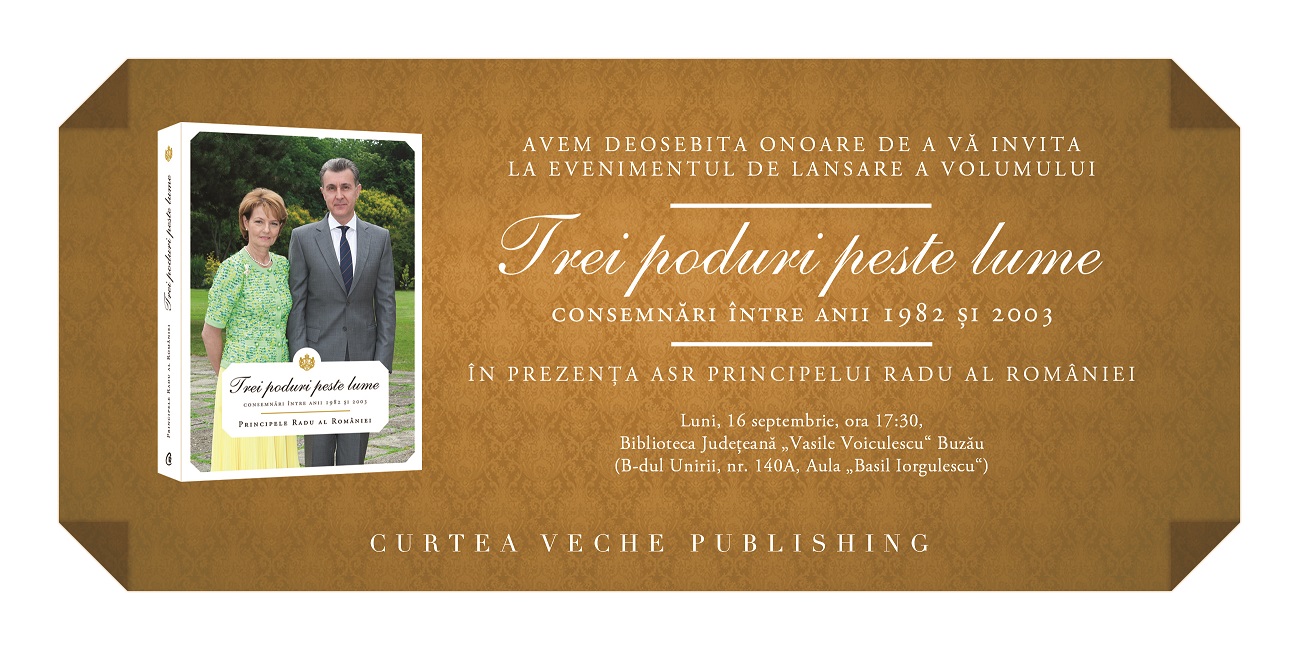 Curtea Veche Publishing vă invită luni, 16 septembrie, începând cu ora 16.00, la evenimentul de lansare a volumului “Trei poduri peste lume. Consemnări între anii 1982 și 2003” de ASR Principele Radu al României. Evenimentul va fi găzduit de Biblioteca Județeană “Vasile Voiculescu” Buzău (B-dul Unirii, nr. 140 A, aula “Basil Iorgulescu”) și va avea loc în prezența Alteței Sale Regale Principelui Radu. Oficiile de gazdă vor fi făcute de domnul Sorin Burlacu, Director al Bibliotecii.