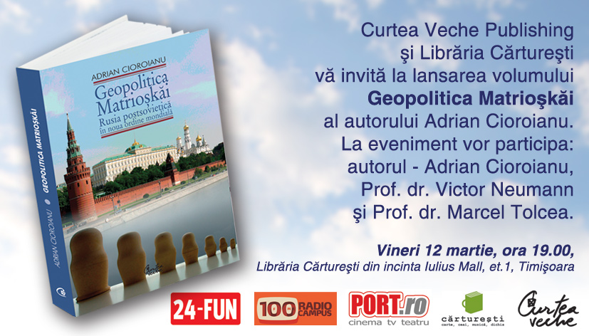 Vineri, 12 martie, la ora 19:00, Curtea Veche Publishing şi Librăria Cărtureşti Timişoara vă invită la lansarea volumului Geopolitica Matrioşkăi, al autorului Adrian Cioroianu. Evenimentul va avea loc la Librăria Cărtureşti, în incinta Iulius Mall, etaj 1, Timişoara, în prezenţa autorului – Adrian Cioroianu, Prof. Dr. Victor Neumann şi Prof. Dr. Marcel Tolcea.