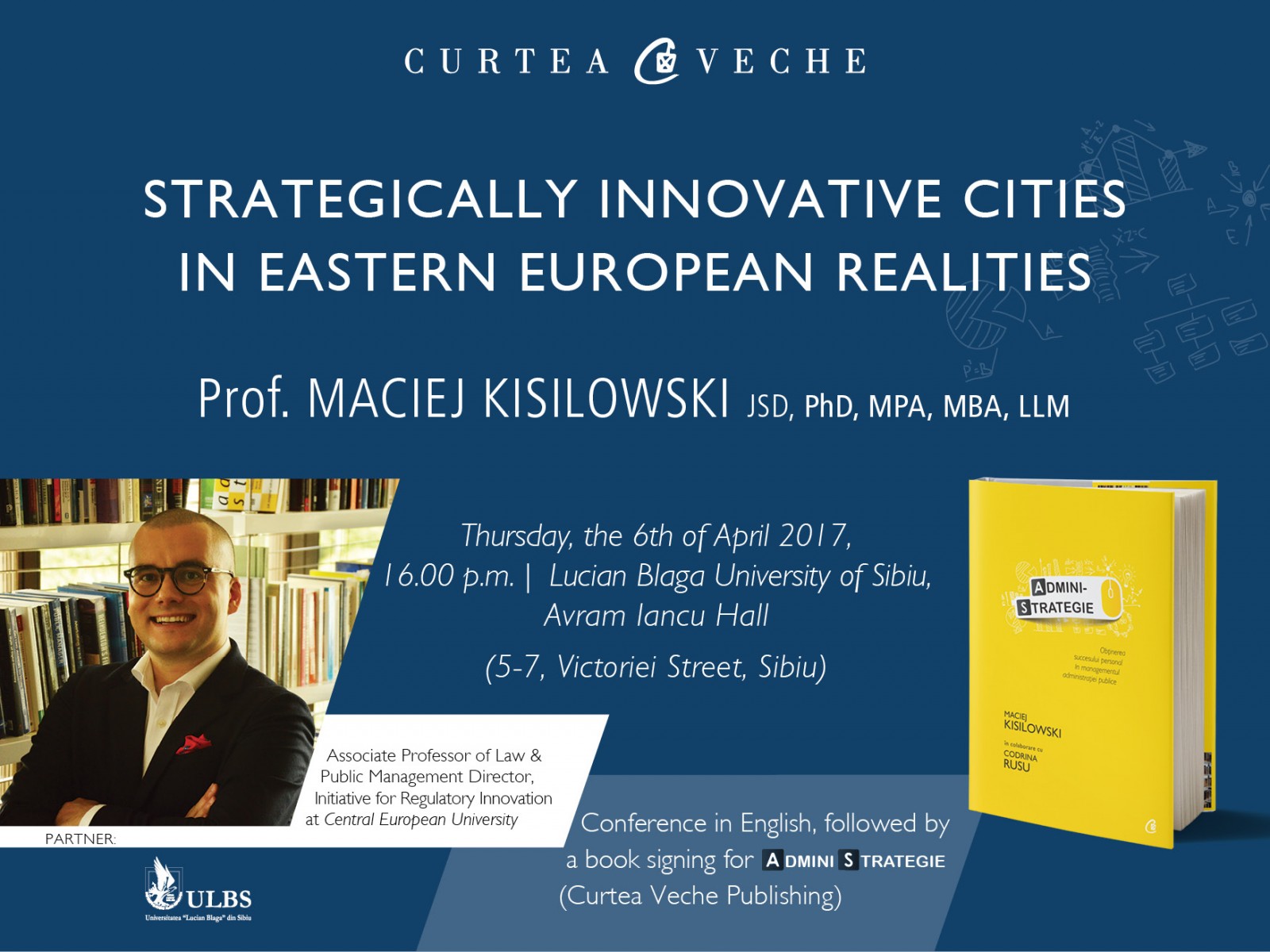 Curtea Veche Publishing și Universitatea “Lucian Blaga” din Sibiu vă invită joi, 6 aprilie 2017, începând cu ora 16:00, la conferinţa cu titlul Strategically Innovative Cities in Eastern European Realities, susţinută de Maciej Kisilowski, profesor de drept și de management public la Central European University din Budapesta, specializat în educația executivă a managerilor din afaceri și din administrația publică.