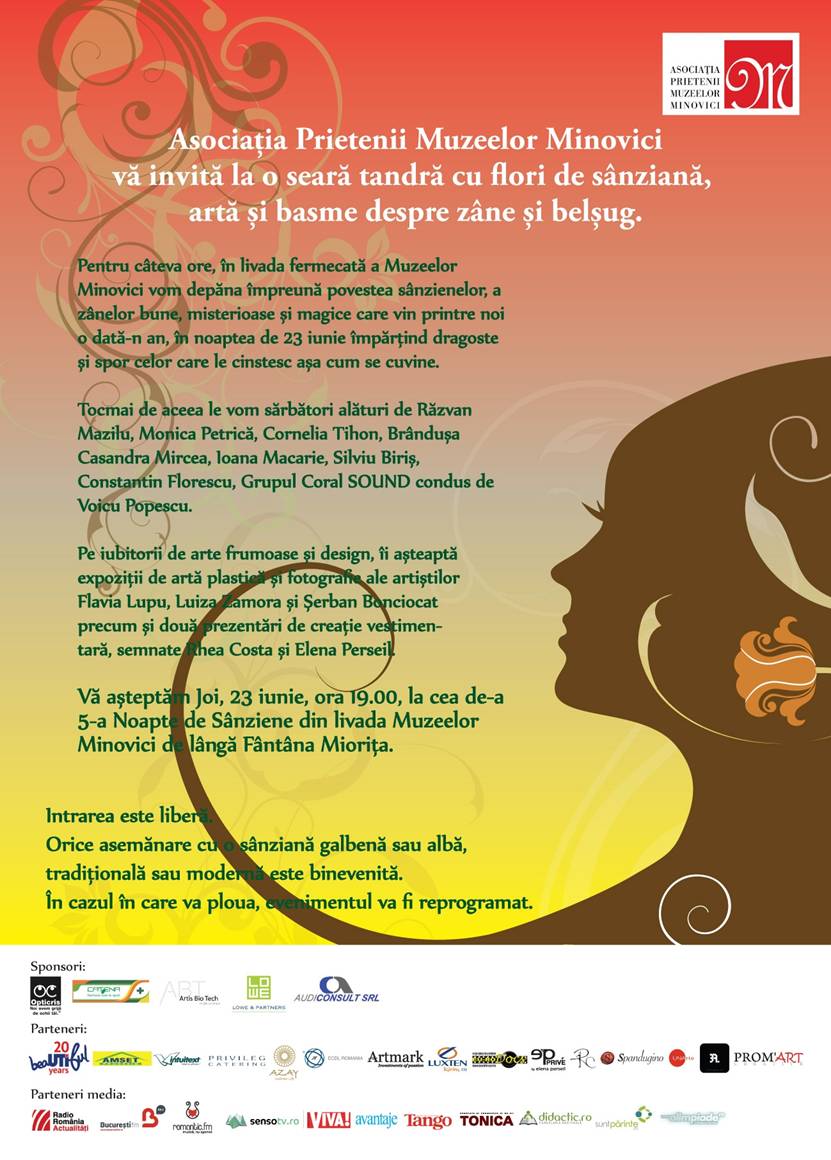 Organizatorii Nopții de Sânziene au pregătit expoziții, concursuri, proiecții de filme, dans, teatru și cântec, precum și alte moment speciale. Editura Curtea Veche va fi prezentă cu cele mai frumoase cărți, alese pe sprânceană pentru cei ce aleg să își petreacă seara și noaptea de Sânziene în Livada Minovici.