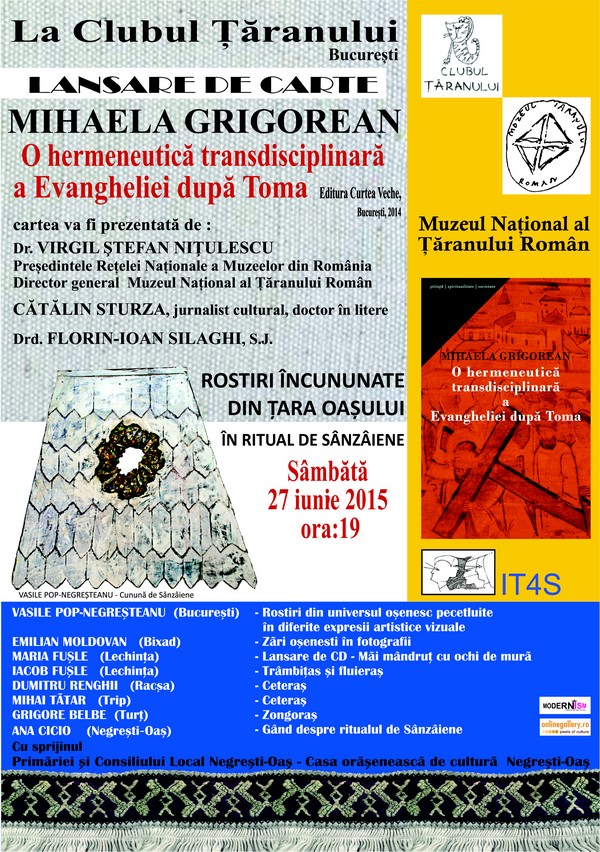 Curtea Veche Publishing vă invită sâmbătă, 27 iunie, ora 19.00, Clubul Țăranului din cadrul Muzeului Național al Țăranului Român, pentru lansarea cărții “O hermeneutică transdisciplinară a Evangheliei după Toma”.