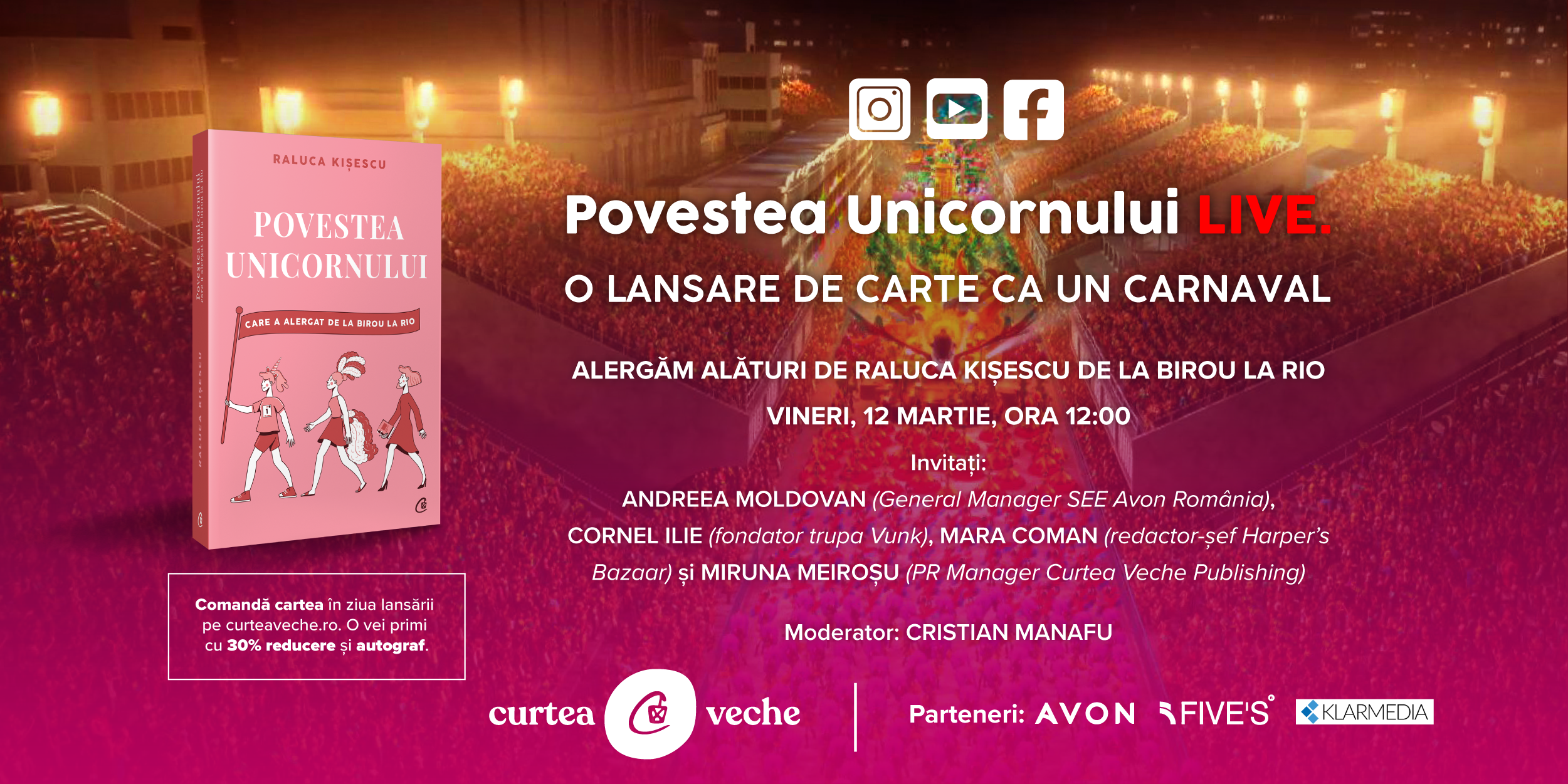 Alături de partenerii noștri – compania de producție FIVE’s, Avon Cosmetics România și agenția de monitorizare de presă Klarmedia – vă dăm întâlnire pe Facebook, Instagram și YouTube Curtea Veche Publishing într-un LIVE colorat, de sărbătoare, ca un carnaval. Evenimentul va fi moderat de Cristian Manafu (Evensys) și îi va avea ca invitați pe Andreea Moldovan (General Manager SEE Avon România, Cornel Ilie (fondator trupa Vunk), Mara Coman (redactor-șef Harper’s Bazaar) și Miruna Meiroșu (PR Manager Curtea Veche Publishing).