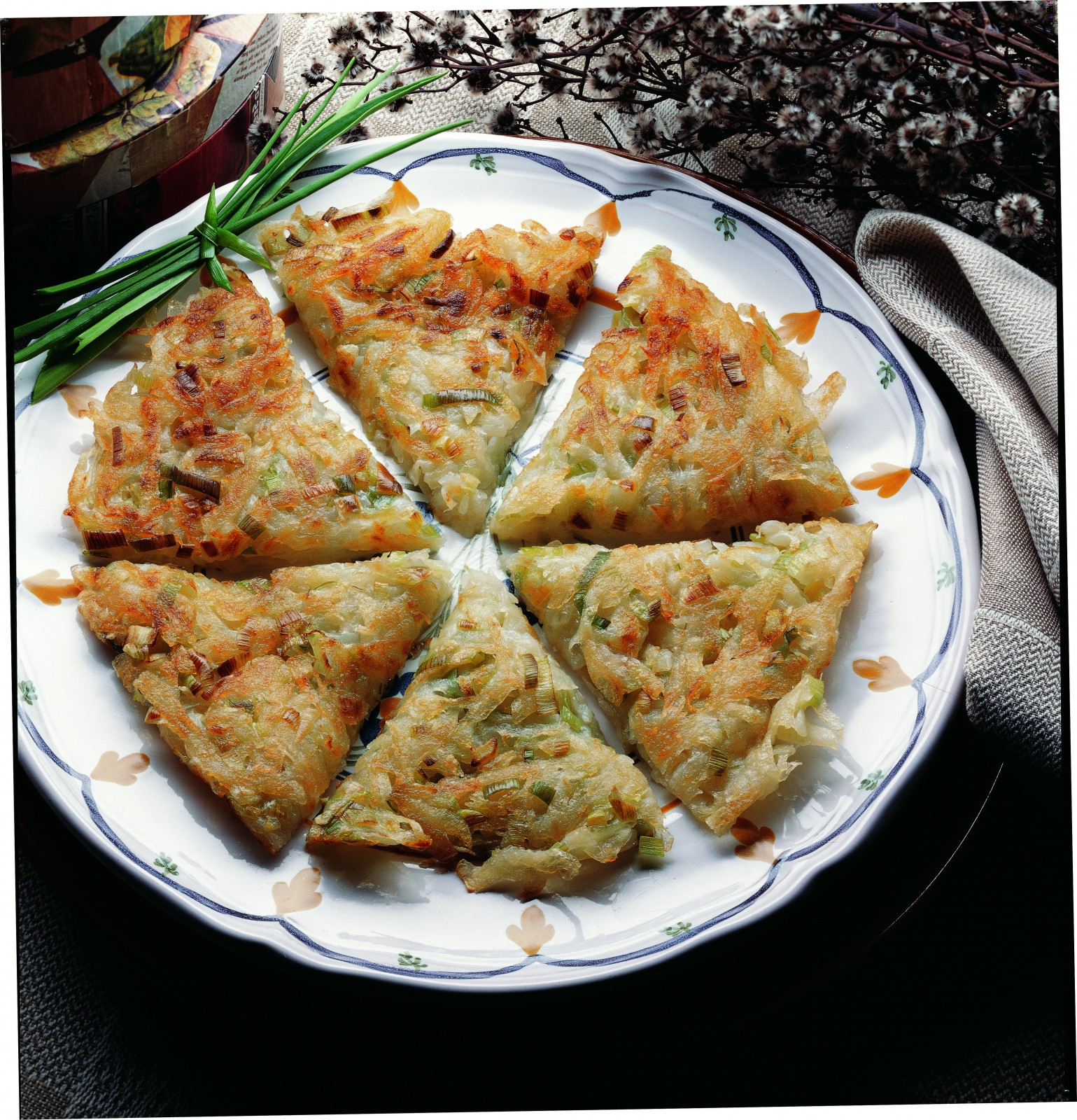 Într-o tigaie mare neaderentă, la foc mediu spre mare, încălziţi cele două linguri din untul rămas şi cele două linguri de ulei. Adăugaţi amestecul de cartofi şi praz, apoi aplatizaţi-l bine cu o spatulă în tigaie. Acoperiţi şi gătiţi la foc mediu spre mare până când compoziţia se rumeneşte dedesubt, 3–5 minute. Puneţi o farfurie deasupra tigăii şi, ţinând-o ferm, întoarceţi tigaia. Prin alunecare, puneţi clătita la loc în tigaie ca să se facă şi pe partea cealaltă. Aplatizaţi bine din nou, acoperiţi vasul şi lăsaţi plăcinta să se prăjească până când devine crocantă şi pe cealaltă parte, cel mult 3–5 minute. Puneţi un platou rotund şi cald deasupra tigăii şi răsturnaţi încă o dată, astfel încât plăcinta să se aşeze frumos pe platou. Tăiaţi-o radial şi serviţi-o caldă.
