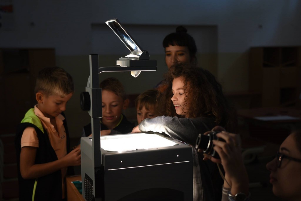 Mai departe, ajungem tocmai în sala 2, în care am acoperit geamurile pentru întunericul necesar atelierului de Teatru de umbre Ne-am cocoțat pe scări pentru a crea ambianța necesară, dar nu ne-a deranjat pentru că așa au putut cei mici să ne demonstreze că lumina și umbra pot spune și ele o poveste, iar miturile grecești au devenit surse de inspirație pentru micii cititorii. Au avut nevoie doar de un retroproiector, de multă imaginație și eroii din Grecia Antică au prins viață alături de Liliana Basarab.