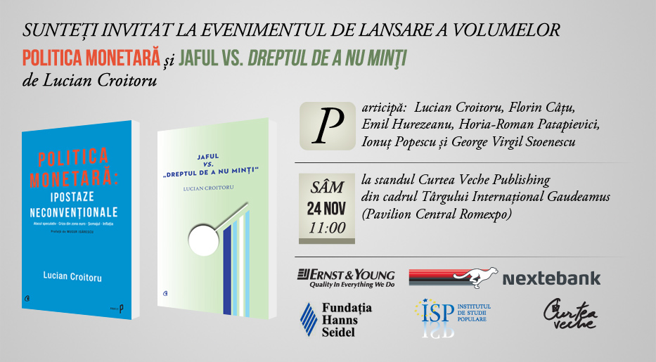Vă invităm sâmbătă, 24 noiembrie 2012, ora 11.00, la standul editurii din cadrul Târgului Internațional de Carte Gaudeamus (Pavilion Central Romexpo), la evenimentul de lansare a volumelor „Politica monetară” şi „Jaful vs. Dreptul de a nu minţi” de Lucian Croitoru. La eveniment vor lua cuvântul, alături de autor, Florin Câţu, Emil Hurezeanu, Horia-Roman Patapievici, Ionuţ Popescu, George Virgil Stoenescu.
