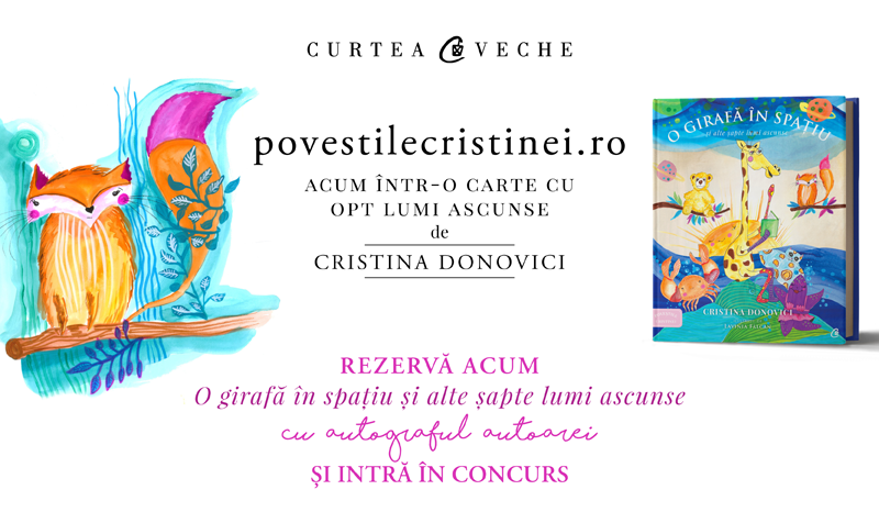 Cristina Donovici, cunoscută pentru blogul PovestileCristinei.ro, debutează cu o carte pentru copii. „O girafă în spațiu și alte șapte lumi ascunse”, cu ilustrații de Lavinia-Iulia Fălcan, adună povești pentru copii între 6 și 10 ani, păstrând temele și personajele dragi celor mici, dar adaptate vremurilor noastre. Cartea este de astăzi disponibilă cu autograful autoarei, în precomandă, pe curteaveche.ro, iar toți cei care o vor comanda au ocazia să câștige unul dintre cele două tablouri realizate de ilustratoare cu scene din cele mai frumoase povești.