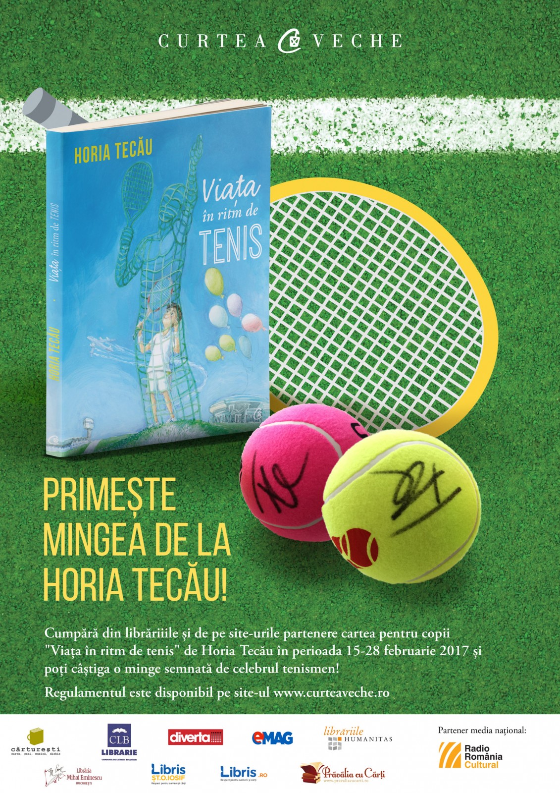 Între 15 și 28 februarie, micii cititori ai cărții “Viața în ritm de tenis” scrisă de Horia Tecău pot câștiga în librării o minge cu autograful celebrului tenismen! Curtea Veche Publishing, alături de parteneri săi, lansează concursul național „Primește mingea de la Horia Tecău!”, adresat tuturor cititorilor interesați de tenis și de un stil de viață activ și sănătos.