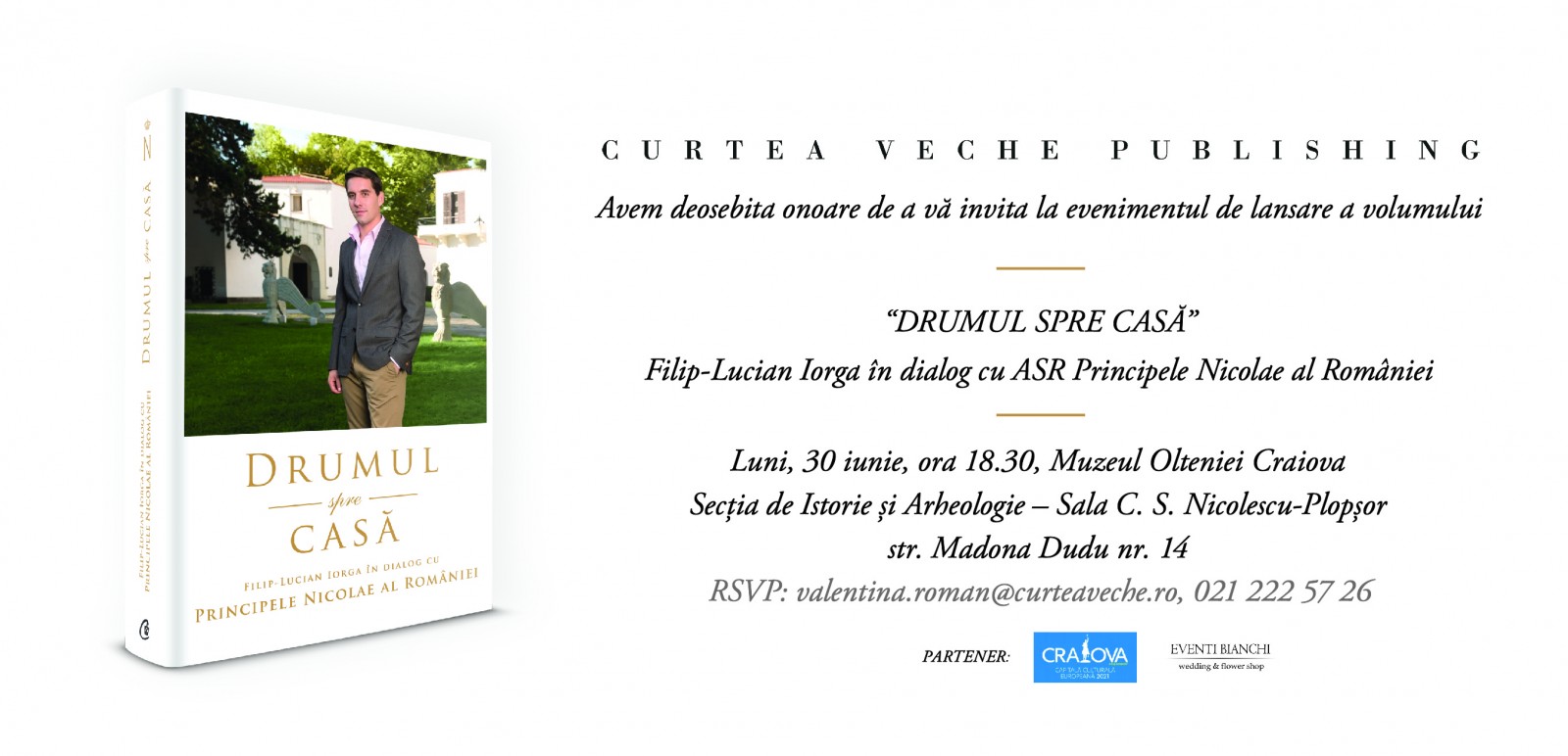 Curtea Veche Publishing lansează luni, 30 iunie, ora 18.30, la Muzeul Olteniei Craiova – Secția de Istorie și Arheologie, Sala C.S. Nicolescu Plopșor (str. Madona Dudu nr. 14), “Drumul spre casă. Filip-Lucian Iorga în dialog cu Principele Nicolae al României”, prima carte dedicată celui mai tânăr membru al Casei Regale a României, în colecția “Cărți Regale”. Evenimentul are loc în prezența ASR Principelui Nicolae al României. Intrarea este liberă și include și o sesiune de autografe.