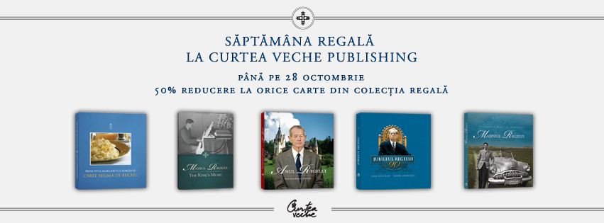 În această săptămână regală, editura doreşte să îşi răsplătească cititorii fideli şi cu o reducere de preţ consistentă. Toate cărţile apărute în seria proiectelor regale vor beneficia pe site-ul www.curteaveche.ro de o reducere de 50% începând din data de 22 octombrie până la finalul zilei de 28 octombrie.