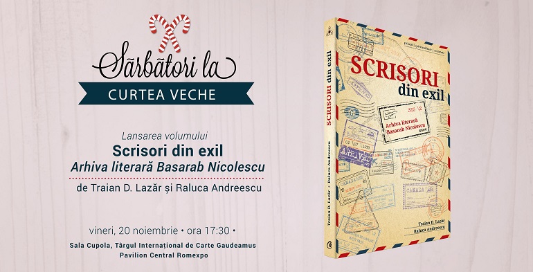 Vineri, 20 noiembrie 2015, Curtea Veche Publishing vă invită la evenimentul de lansare a volumului „Scrisori din exil. Arhiva literară Basarab Nicolescu” de Traian D. Lazăr și Raluca Andreescu, din cadrul Târgului Internațional Gaudeamus – Carte de învățătură 2015. Evenimentul va avea loc între orele 17.30 și 18.30 în Sala Cupola (Pavilion Central Romexpo, sub scările centrale).