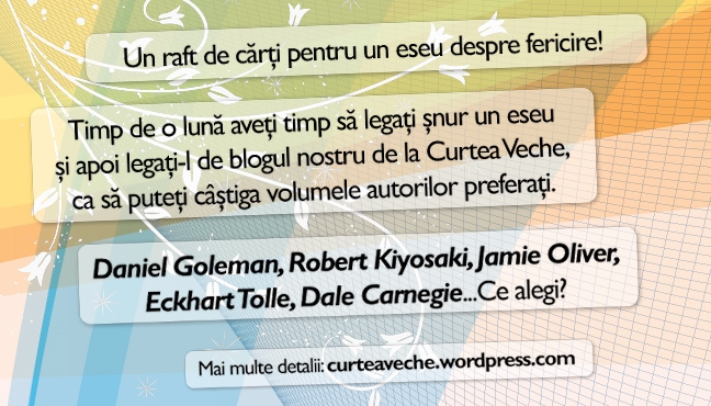 Daţi şi un link de pe blogurile voastre către acest post pentru a ne anunţa că participaţi la concurs. Vă aşteptăm, timp de o lună, să vă ardeţi la foc mic neuronii cu marea întrebare despre fericire. Când gândurile vor fi bine rumenite, legaţi şnur un eseu şi apoi legaţi-l de blogul nostru de la Curtea Veche.